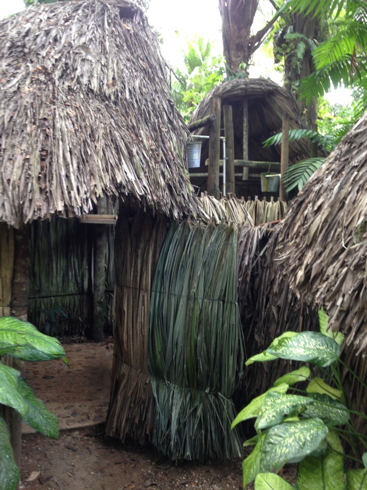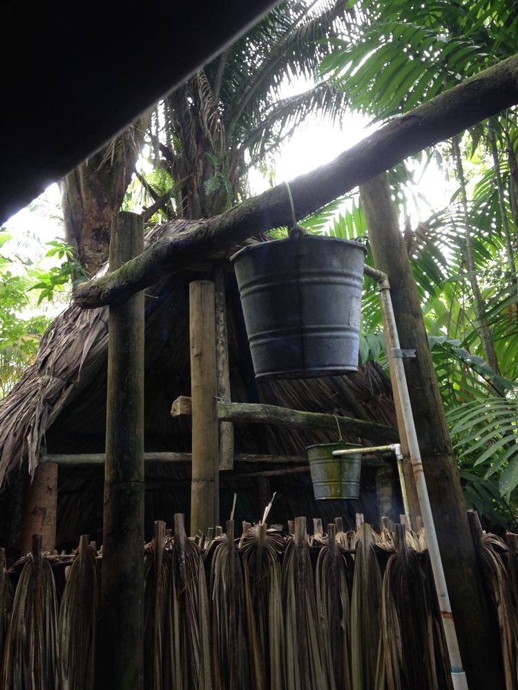 These thatched huts are actually lodge showers for backpackers or whoever... the showerheads are buckets with holes punched in the bottom. |
